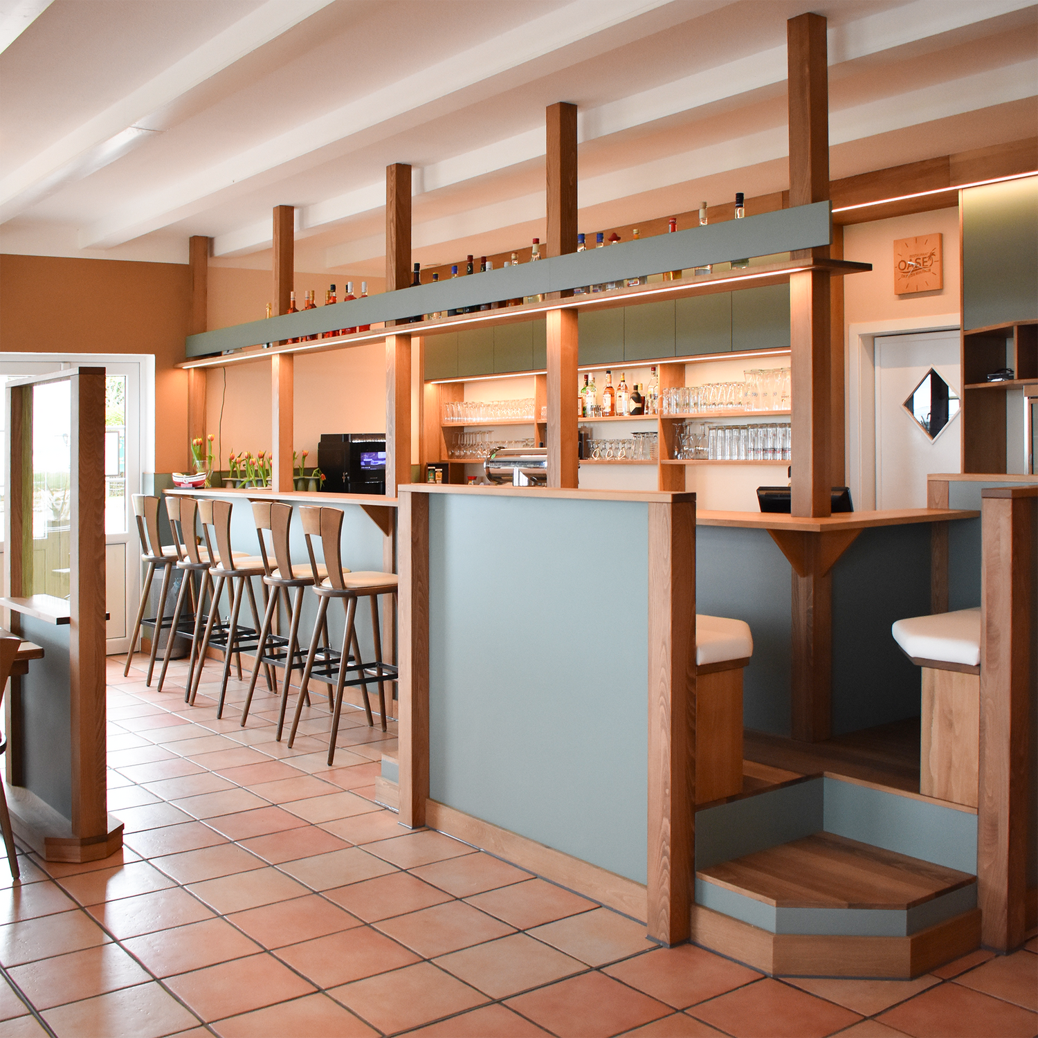 Für dieses Restaurant haben wir einen individuellen Tresen entworfen, gefertigt und farblich abgestimmt. Das Zusammenspiel aus warmem Holz und ruhigen Farbtönen schafft eine einladende Atmosphäre und fügt sich harmonisch in das Gesamtkonzept des Raumes ein.