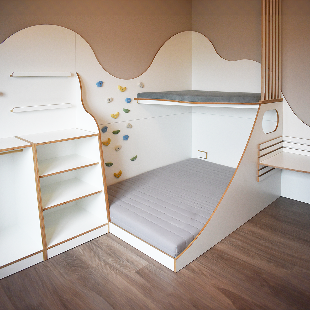 mit integrierter Kletterwand, abnehmbarer Rutsche und mitwachsendem Schreibtisch – ein Raum zum Spielen, Lernen und Wachsen