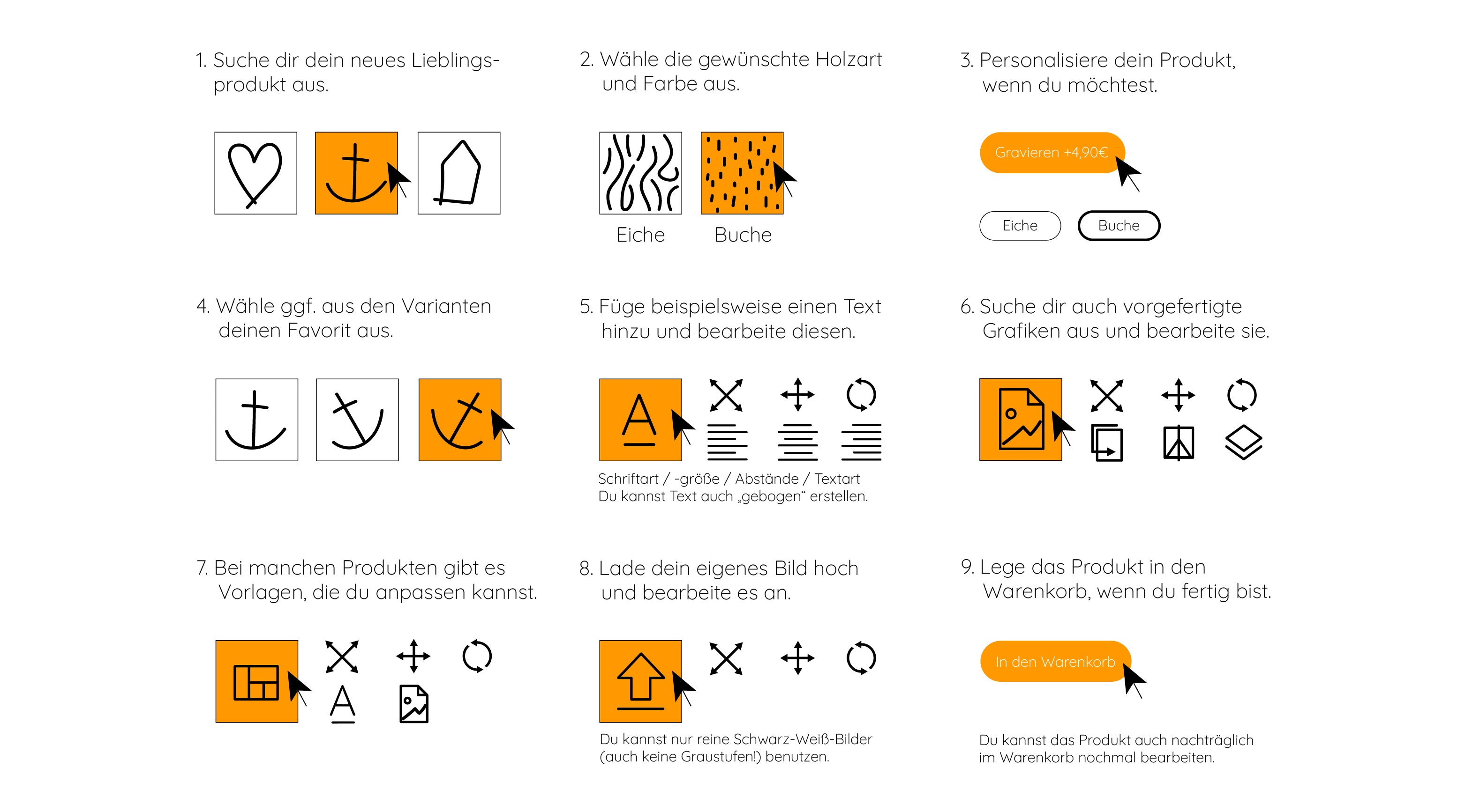 Am Ende der Seite haben wir dir eine bildliche Kurzanleitung mit den wichtigsten Funktionen des Konfigurators zusammengestellt. Für weitere Erklärungen oder individuelle Anfragen kontaktiere uns gern telefonisch, per E-Mail oder WhatsApp.